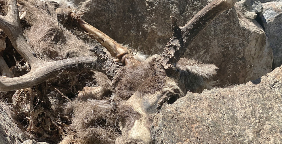 A deer lay so close to the side of the trail that its antlers could trip a two-legged hiker who wasn’t looking where she was going. At least it had been a deer once, back when it still had eyeballs and all of its parts were still attached. Now he lay in pieces with his wife’s legs, spine, and femurs mixed in with his own. A little farther back, a fawn’s head lay on another rock among older skulls, pelvises, and hooves.