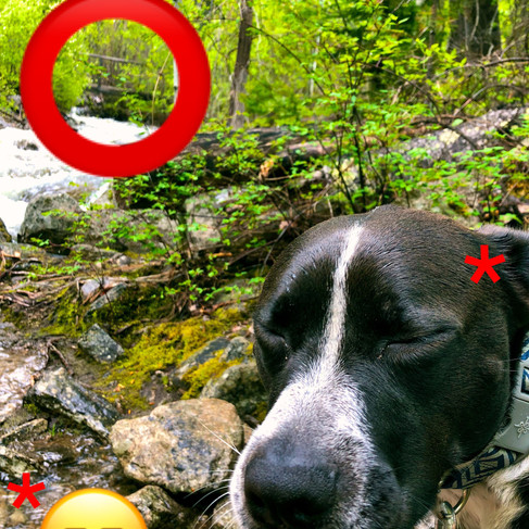 By the time my paws were covered in mud again, there was an all-too-familiar hissing coming from the trees ahead. It gave me that feeling in my tummy that made me want to run and make sure it wasn’t what I thought it was. But Mom was still back there hopping around the dry parts of the trail like the puddles were hot lava and I’d promised I wouldn’t leave her behind.
